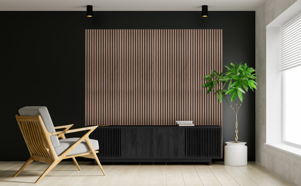 Verfraai uw interieur met deze akoestische lamellenpanelen met donker walnoot houteffect, ideaal voor iedereen die op zoek is naar een verfijnde designoplossing met het extra voordeel van geluidsreductie. Deze panelen zijn ideaal voor iedereen die op zoek is naar een geraffineerde ontwerpoplossing met extra geluidsreductie. Of ze nu voor een professionele werkruimte of een gezellig huis worden gebruikt, ze bieden topkwaliteit, uitzonderlijke functionaliteit en een tijdloze stijl.