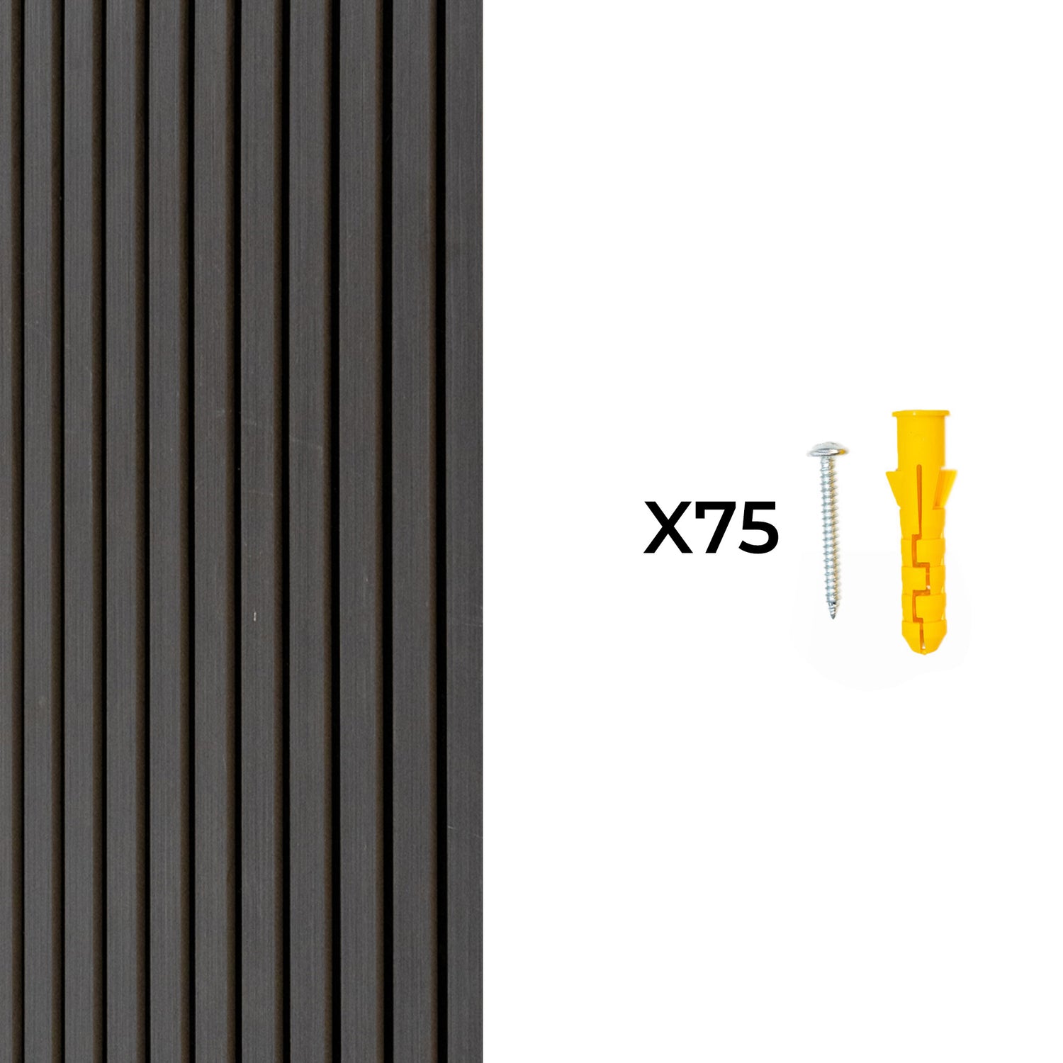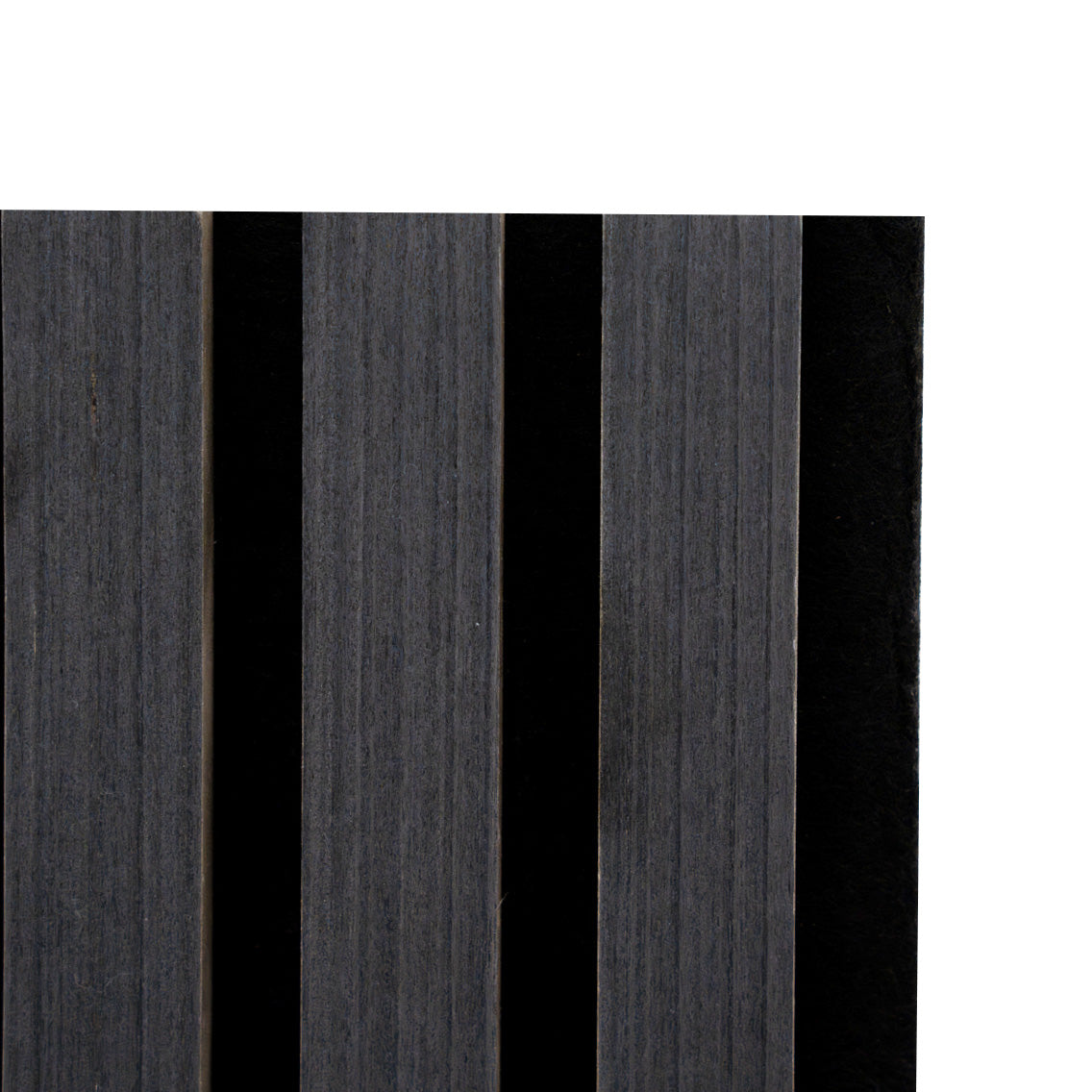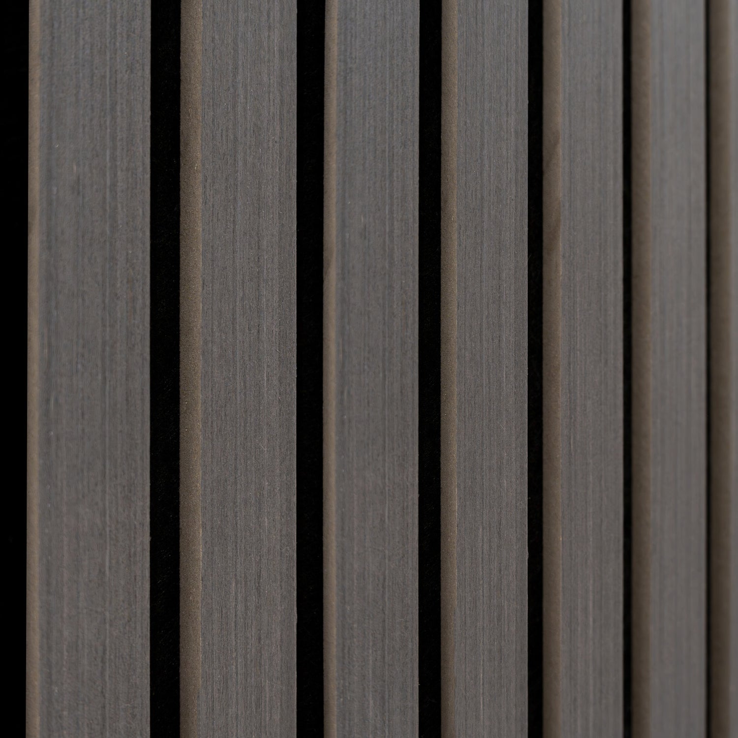 De met precisie vervaardigde lamellen zijn gemaakt van duurzaam MDF met daarop een fineer van hoge kwaliteit dat de warme, tijdloze uitstraling van natuurlijk Antraciet Grijs hout nabootst. Elke lamel is voorzien van een 9 mm dikke vilten drager die niet alleen zeer effectief is in het reduceren van geluid, maar ook vlamvertragend voor extra veiligheid. De individuele lamellen zijn 27 mm breed en 12 mm diep, met een tussenruimte van 13 mm, wat zorgt voor een moderne, uniforme uitstraling die bij elke inrichting past. De zorgvuldig gekozen materialen zorgen voor zowel visuele aantrekkingskracht als duurzame prestaties.