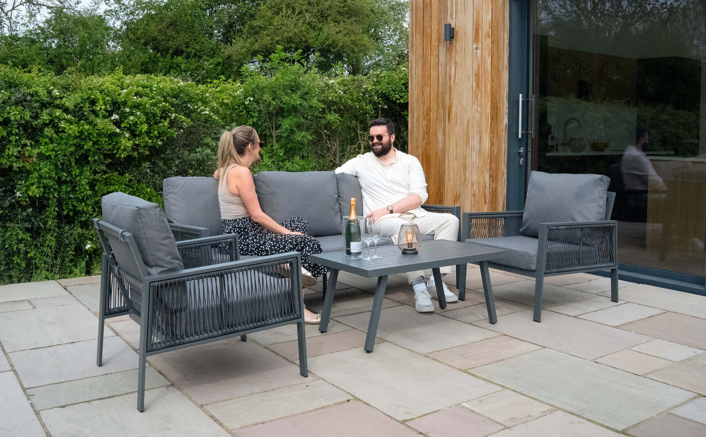 De royale driezitsbank en twee comfortabele fauteuils bieden volop zitruimte voor zowel gezellige samenkomsten als ontspannen uurtjes in je eentje. De bijpassende salontafel maakt de set compleet met een praktische en stijlvolle plek voor drankjes, hapjes of decoratie – perfect voor elke buitengelegenheid.