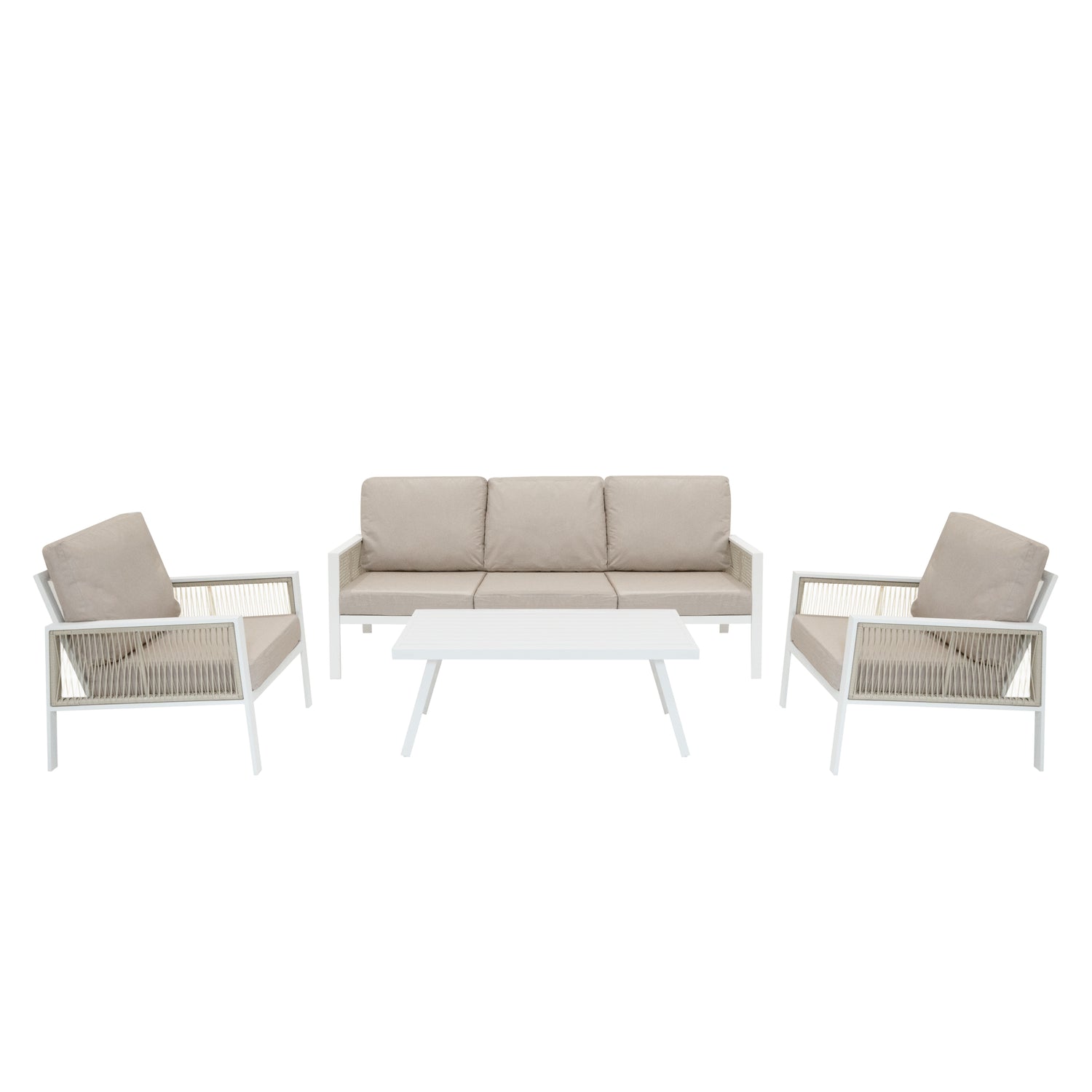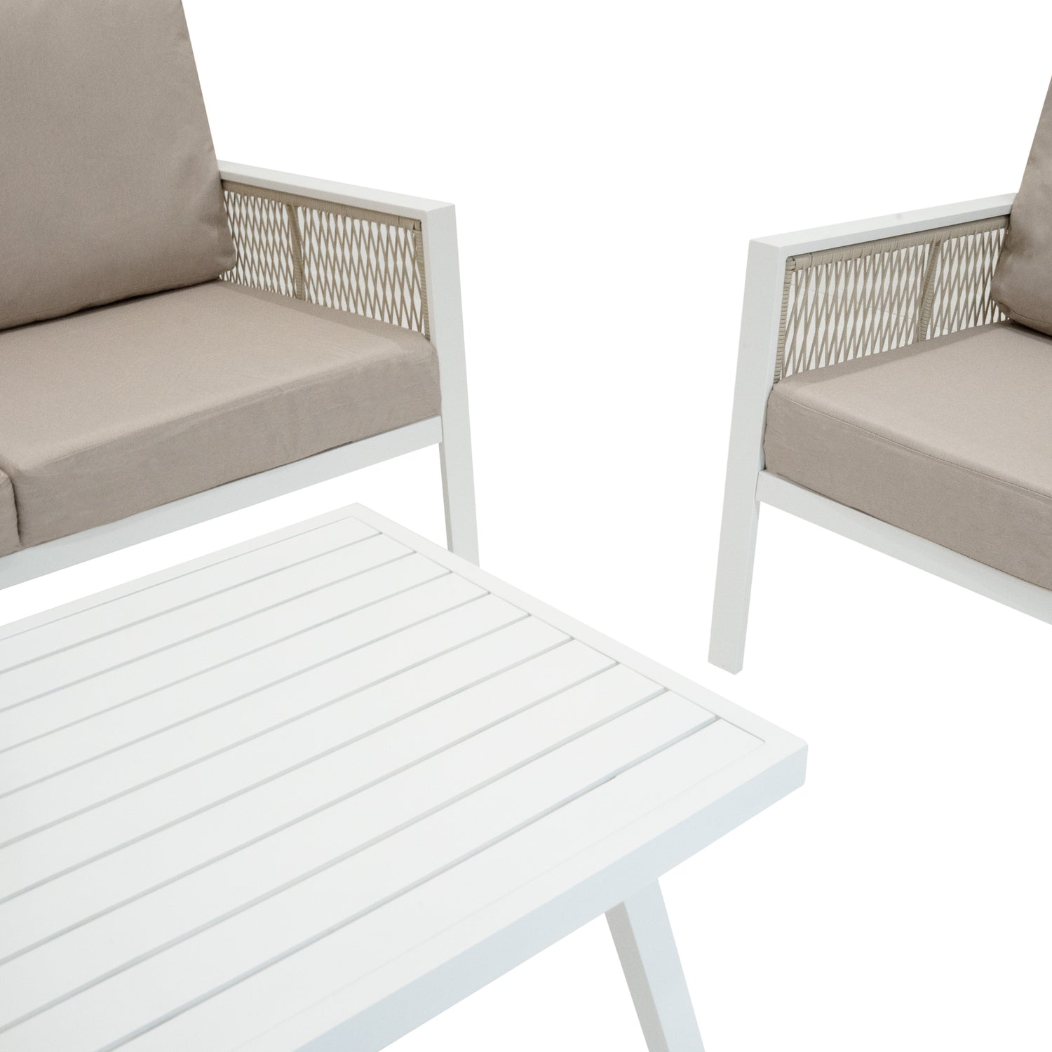 De royale driezitsbank en twee comfortabele fauteuils bieden volop zitruimte voor zowel gezellige samenkomsten als ontspannen uurtjes in je eentje. De bijpassende salontafel maakt de set compleet met een praktische en stijlvolle plek voor drankjes, hapjes of decoratie – perfect voor elke buitengelegenheid.