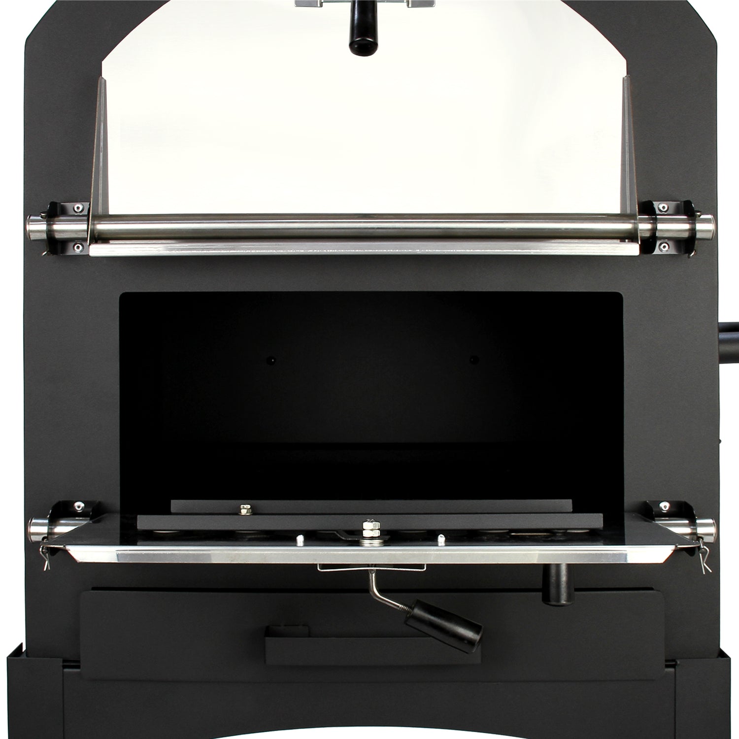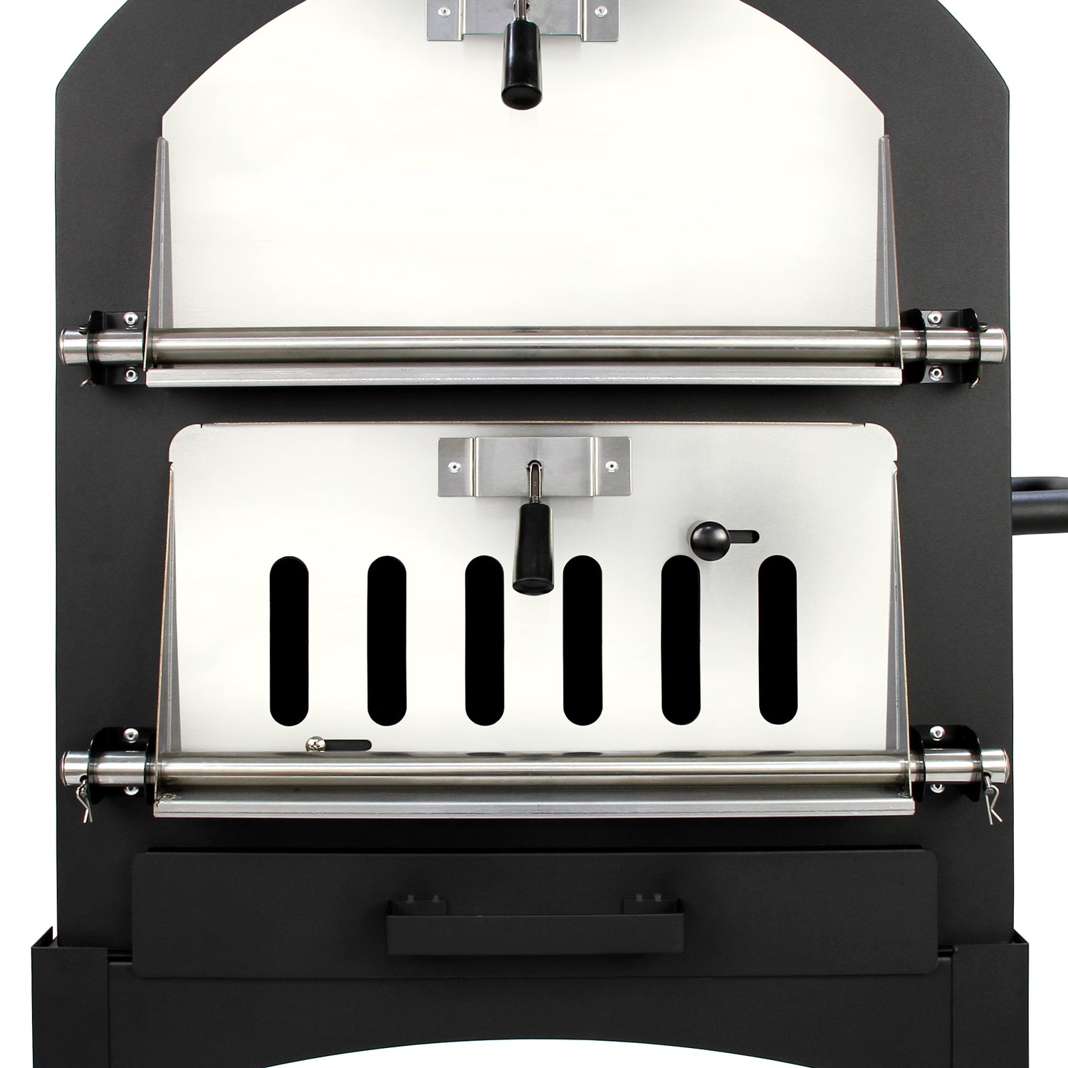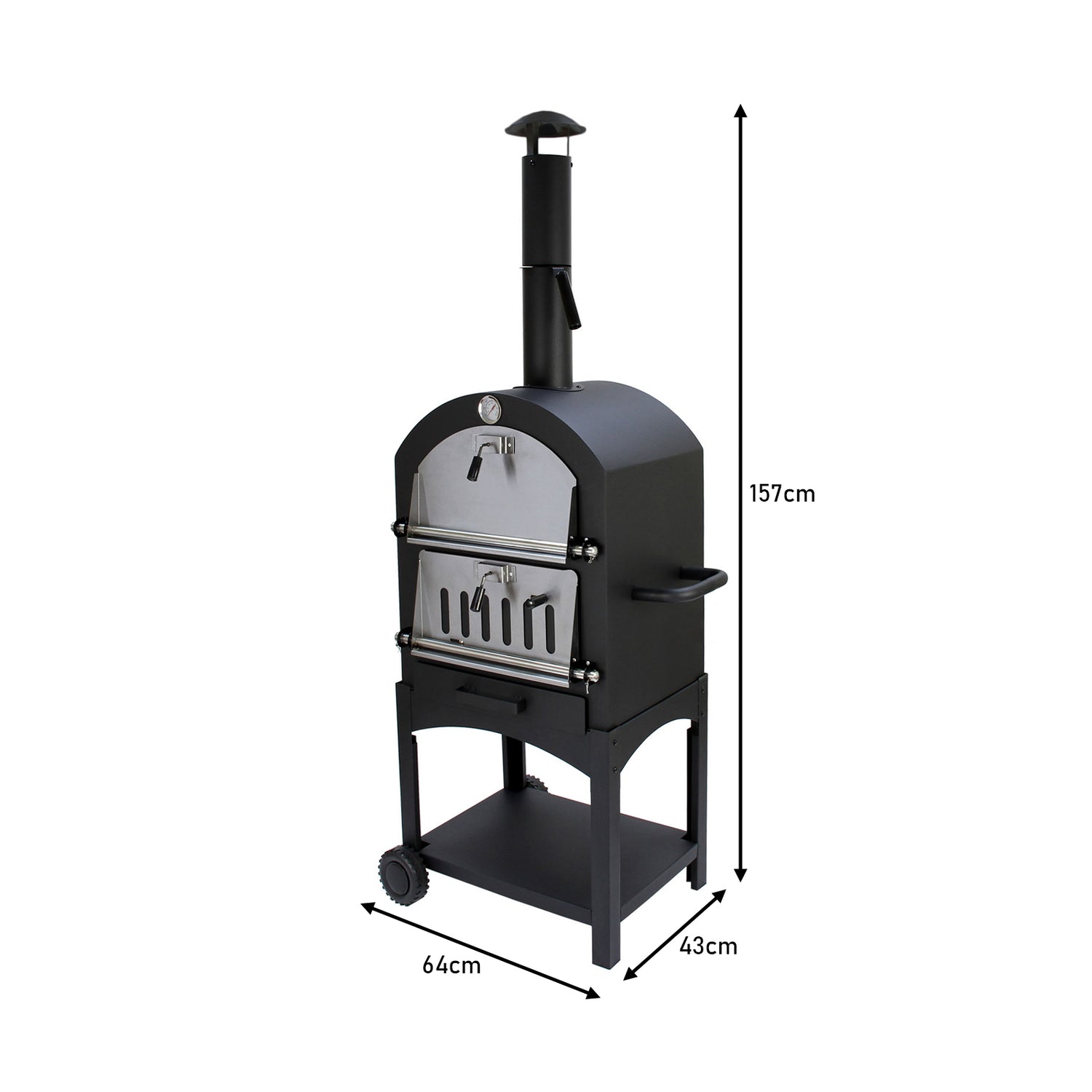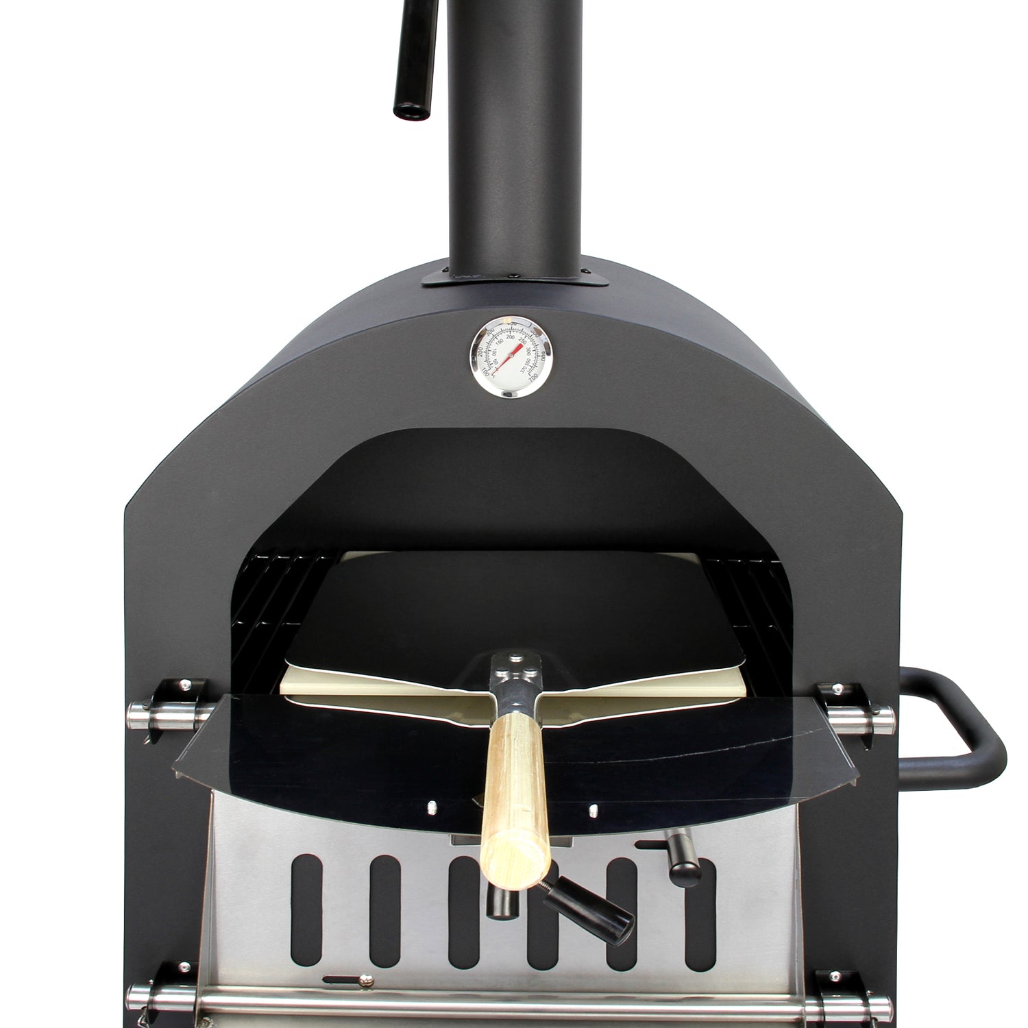 - De pizza oven is draagbaar en heeft twee wielen en een handvat.