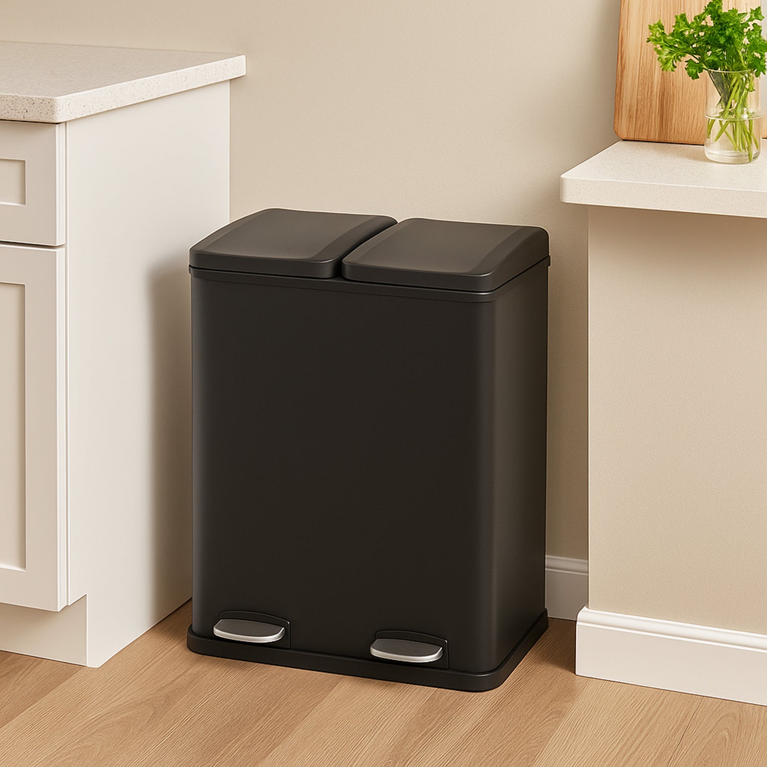 Deze pedaalemmer biedt uw ruimte en is hygiënish. De 2 compartimenten met beide een capiciteit van 30 liter zorgen voor voldoende ruimte voor zowel recycling als algemeen afval. Elke compartiment is te openen door middel van het indrukken van een eigen pedaal. Waardoor er minimaal handcontact nodig is om de prullenbank te bedienen.