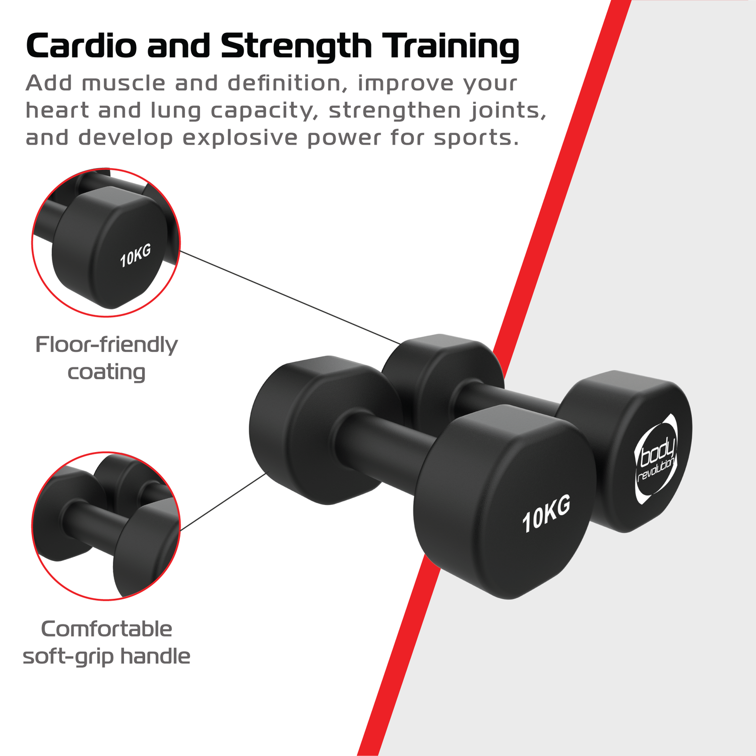 Til je training naar een hoger niveau met deze set neopreen dumbbells van 2 x 10 kg.