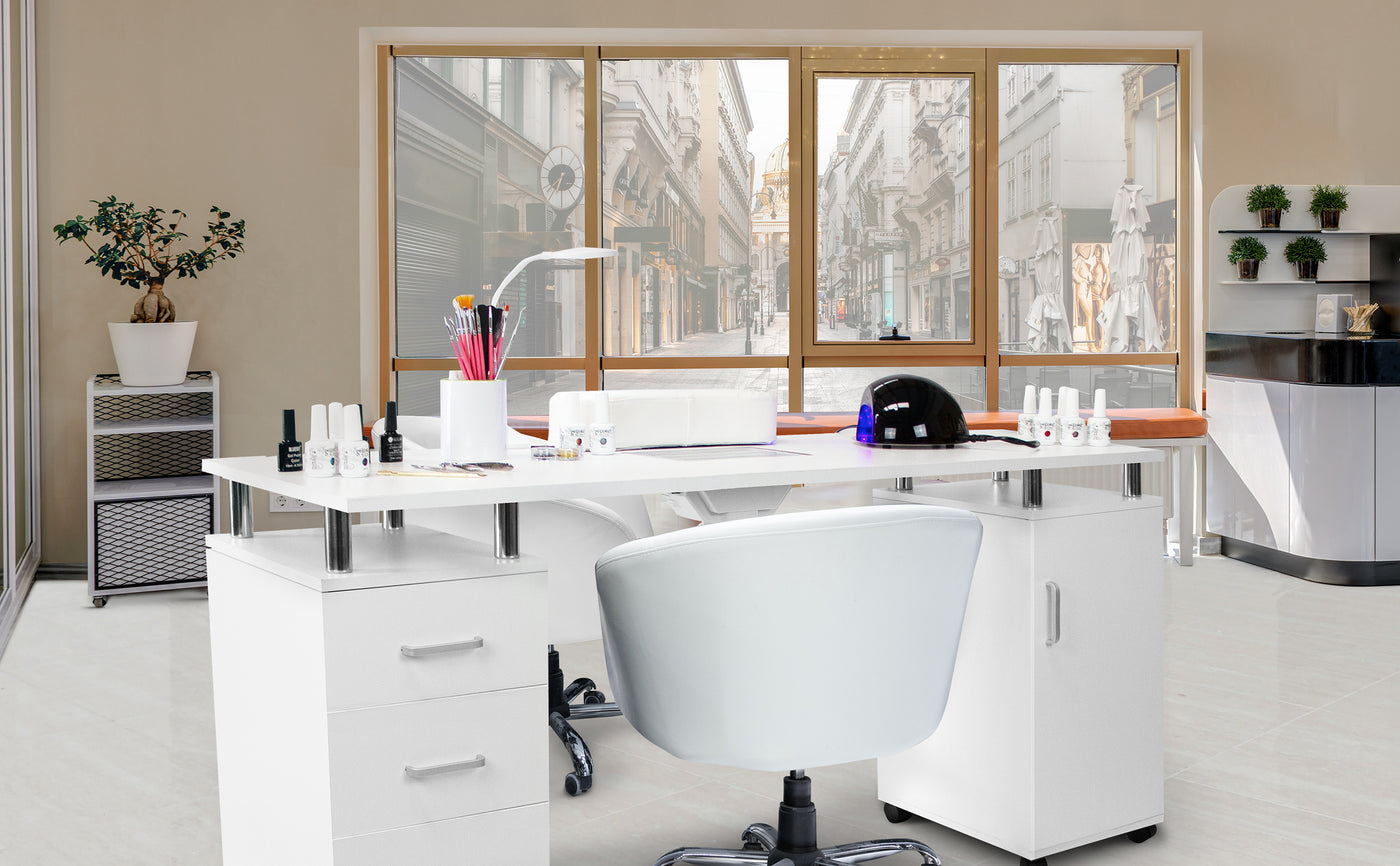 Deze zorgvuldig vervaardigde tafel meet 120 cm x 45 cm en biedt voldoende ruimte voor moeiteloos werken. Met drie lades en een kast met twee interne planken zorgt dit manicurestation ervoor dat je nagelproducten en gereedschappen netjes georganiseerd blijven. Het aanpasbare ontwerp stelt je in staat om de lades en planken naar de unieke behoeften van je salon aan te passen.