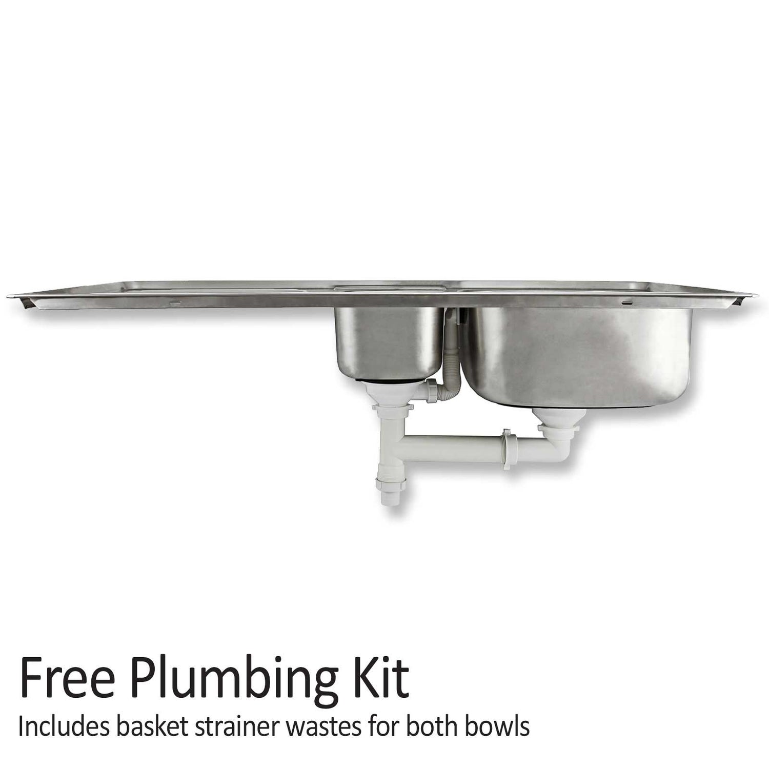 De set bevat een plugloze mandzeef-afvoerset voor beide afvoergaten. Druk om af te sluiten, trek om het water te laten weglopen – allemaal terwijl etensresten netjes worden opgevangen. Je ontvangt ook een gratis installatieset, inclusief afdekplaatje voor de kraangaten, bevestigingsclips en rubberen afdichtstrips.
