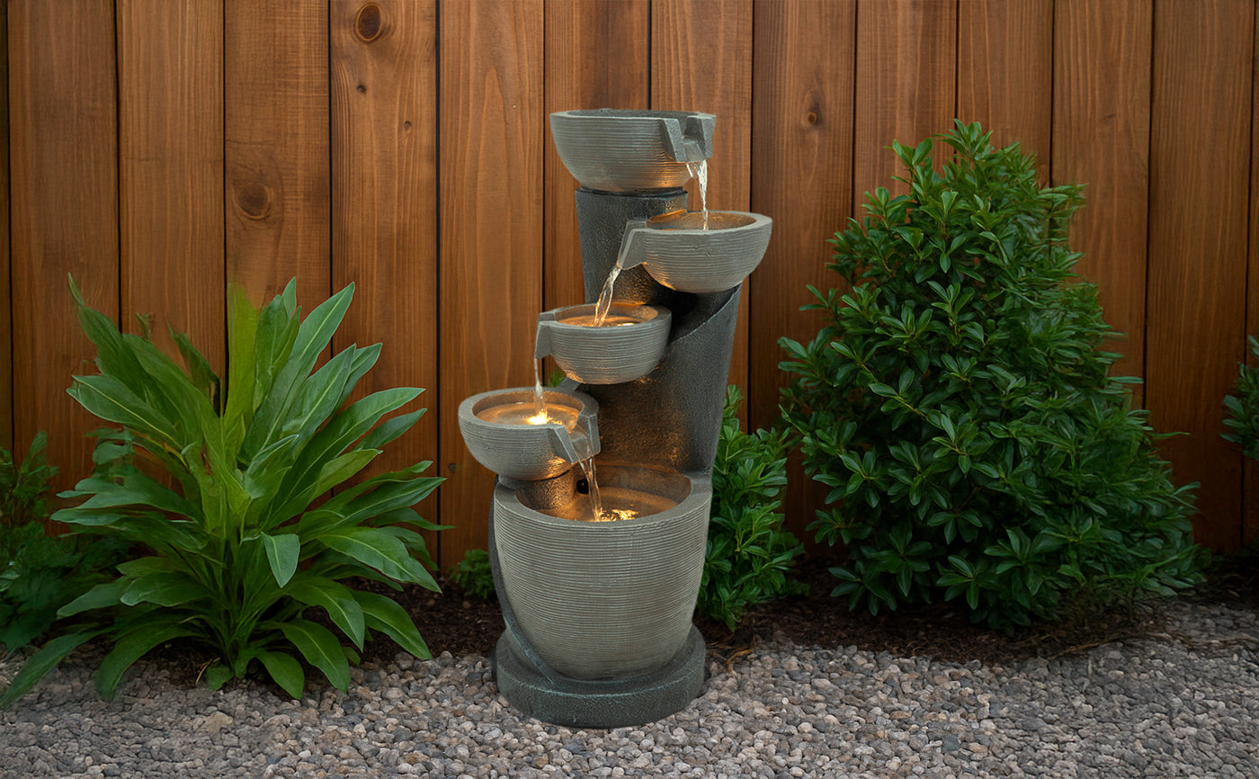 Deze stijlvolle combinatie van modern design en de tijdloze charme van stromend water beschikt over een elegante reeks kommen waar het water op natuurlijke wijze van boven naar beneden stroomt. Dit zorgt niet alleen voor beweging, maar ook voor een rustgevend achtergrondgeluid in je buitenruimte.