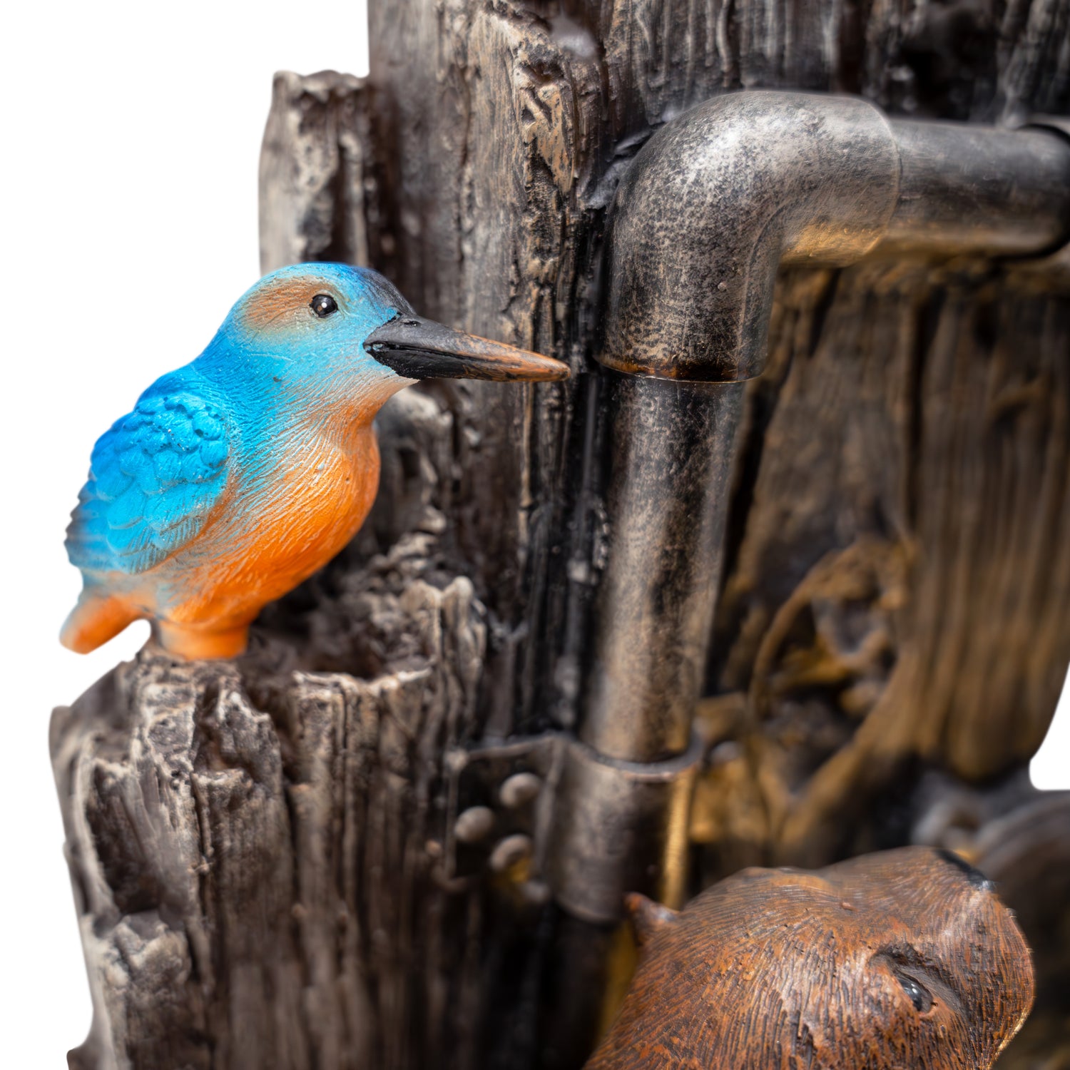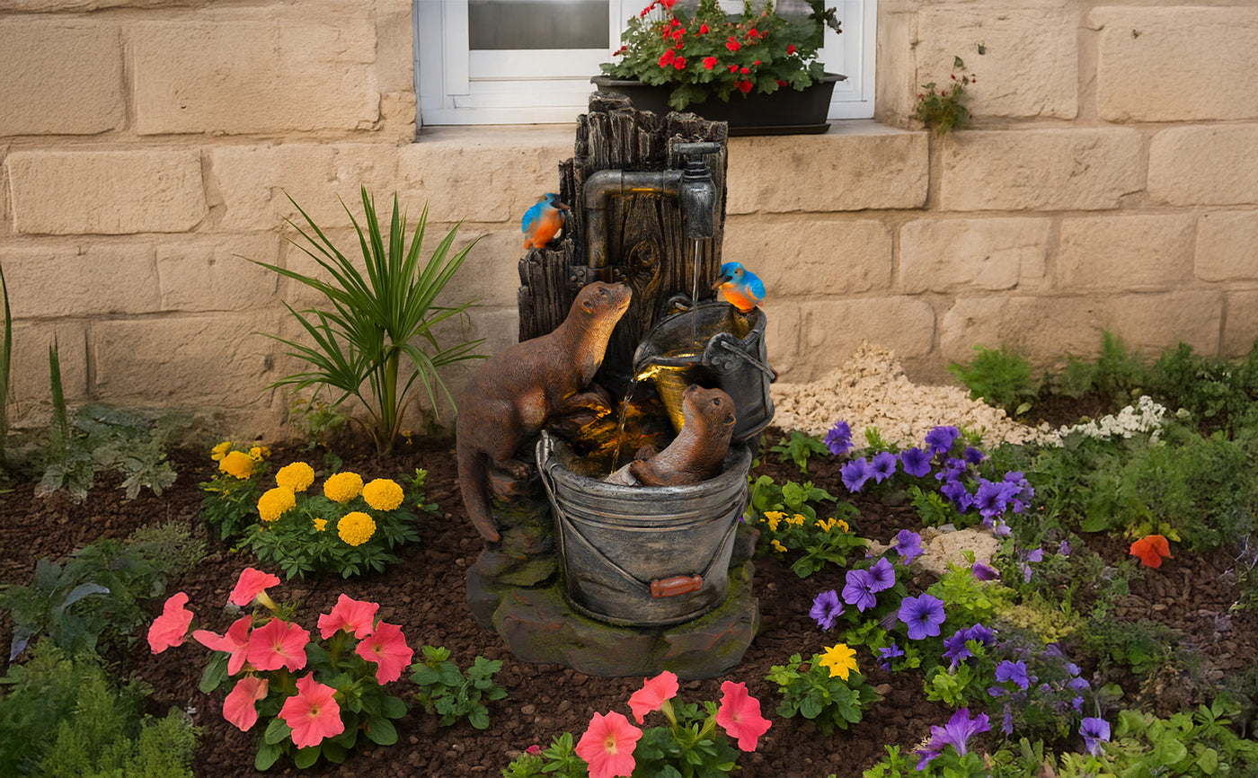 Vervaardigd uit duurzaam en weerbestendig polyresin, toont Otter Oasis verfijnde texturen en levensechte details — van het rustieke houten decor tot de realistische vacht van de otters en het levendige verenkleed van de vogels. Eén otter wordt schattig afgebeeld terwijl hij in een houten emmer baddert, terwijl zijn nieuwsgierige metgezel toekijkt — een speels en levendig tafereel dat direct charme toevoegt aan je tuin of terras. Het water stroomt zachtjes vanuit een tuit in de emmers, terwijl twee geïntegreerde warmwitte LED-lampen een zachte, warme gloed werpen over het stromende water. Dit brengt het geheel echt tot leven, vooral wanneer de avond valt.