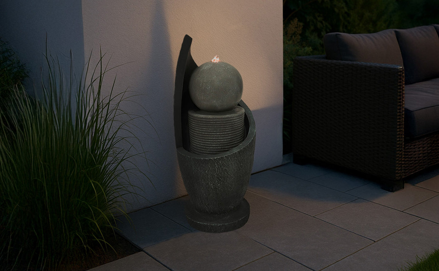 Vervaardigd uit duurzaam polyresin is dit waterornament bestand tegen weer en wind, terwijl het zijn verfijnde, steenachtige uiterlijk behoudt. Het ontwerp draait om een gladde bol die water rustig laat afvloeien langs een geprofileerde zuil, omringd door een elegant gebogen buitenstructuur die diepte en dimensie toevoegt aan het geheel. De enkele warmwitte LED-lamp verlicht de bol subtiel en werpt een zachte, sfeervolle gloed die de rustgevende sfeer versterkt — vooral bij het invallen van de avond.