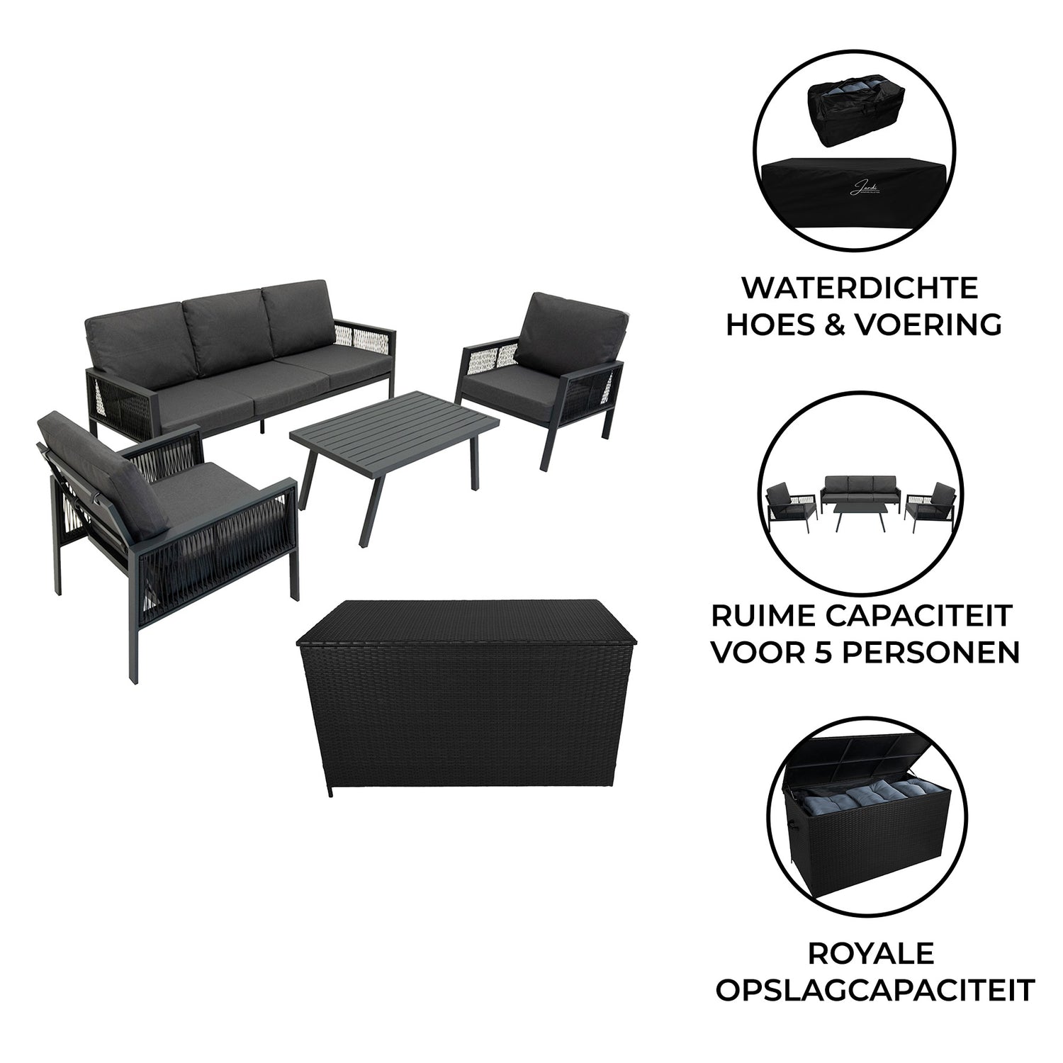 Verhoog je buitenleven met deze prachtig afgestemde tuinset, bestaande uit een stijlvolle 4-delige loungeset van antracietgrijs aluminium en een ruime en praktische zwarte rotan opbergbox.