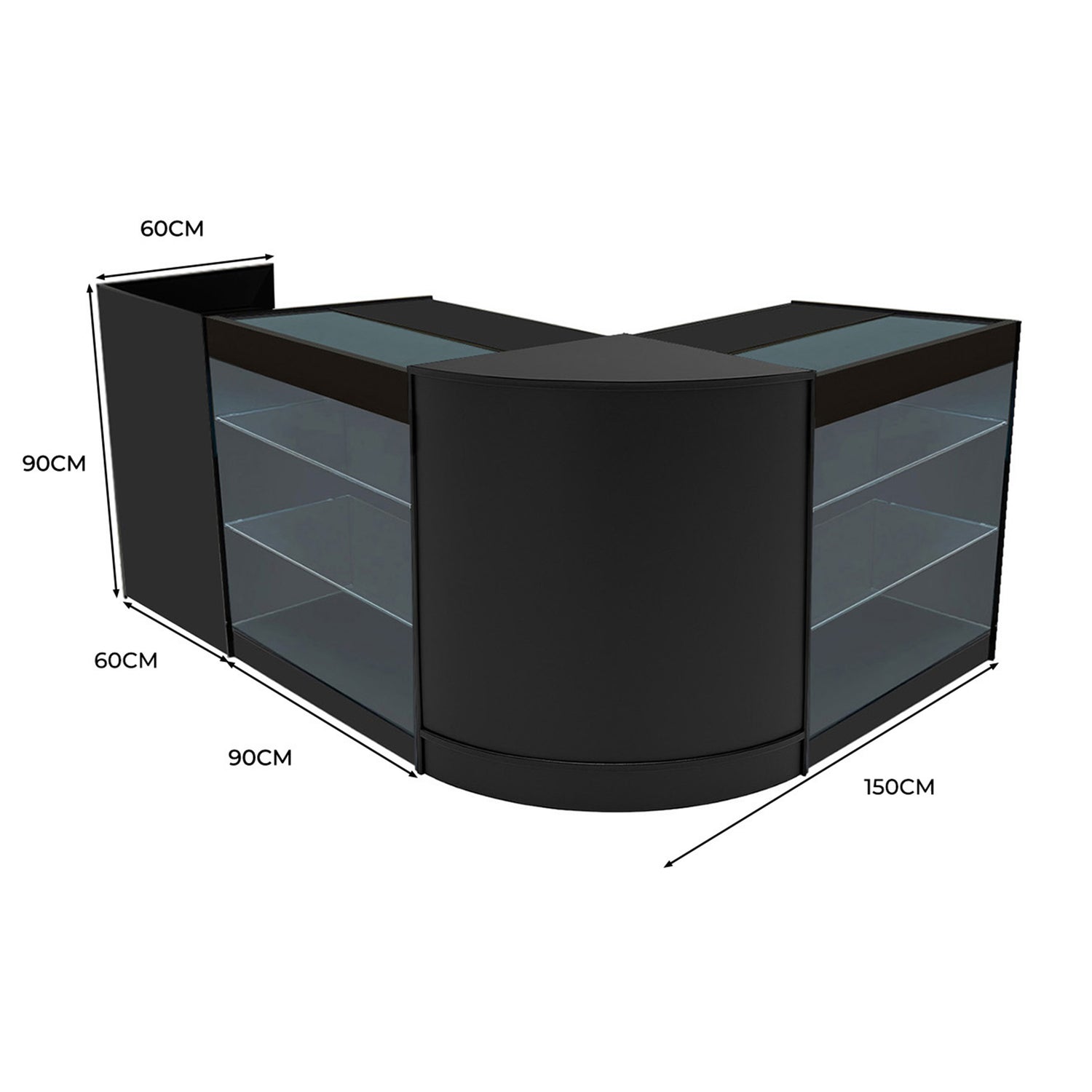 De CM60 gebogen hoekbalie brengt ruimtebesparende functionaliteit en een vloeiende overgang in uw winkelindeling. Het compacte, gebogen ontwerp past netjes in hoeken of verbindt naadloos met rechte balies, voor een samenhangend countersysteem. De gesloten voorkant zorgt voor een strakke, opgeruimde uitstraling, terwijl twee interne schappen (alleen bereikbaar via de achterzijde) discreet opslagruimte bieden voor voorraad of benodigdheden – een slimme oplossing om hoeken optimaal te benutten zonder uw opstelling te onderbreken.