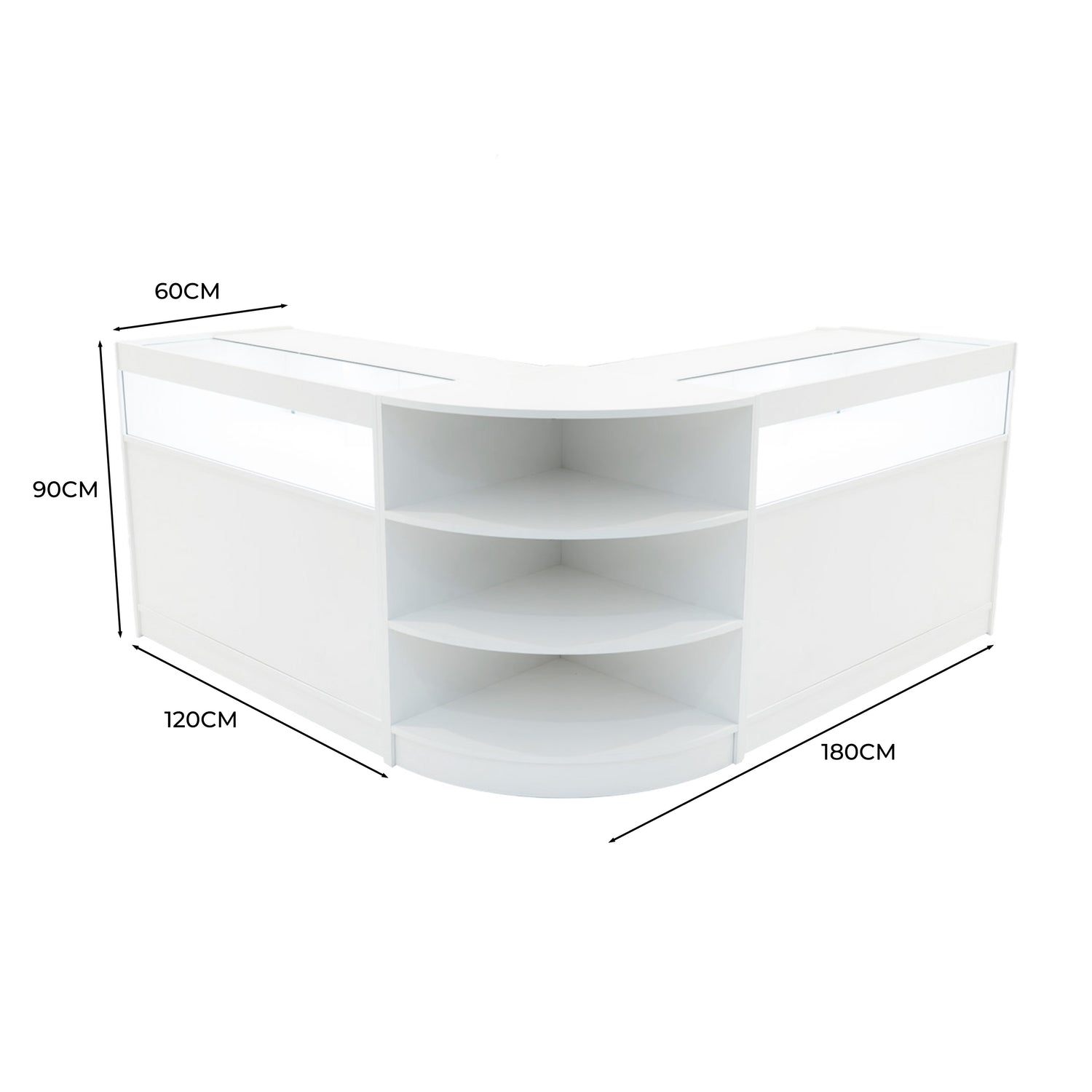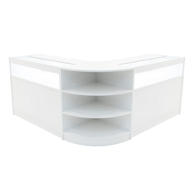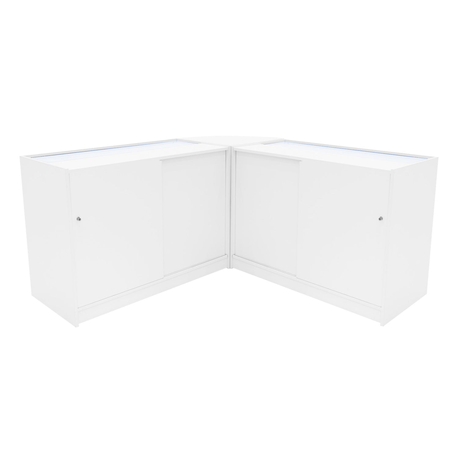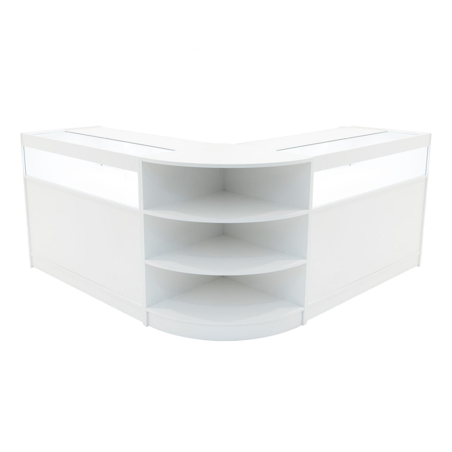 De LM60 gebogen hoekbalie voegt ruimtebesparende functionaliteit en een vloeiende indeling toe aan je winkelruimte. Dankzij het compacte, gebogen ontwerp past deze balie naadloos in hoeken of sluit hij perfect aan op rechte balies om een samenhangend baliesysteem te creëren. Met drie open, klantgerichte displayplanken maximaliseert de LM60 de zichtbaarheid en toegankelijkheid van producten – ideaal om hoekruimtes optimaal te benutten zonder de indeling te verstoren.